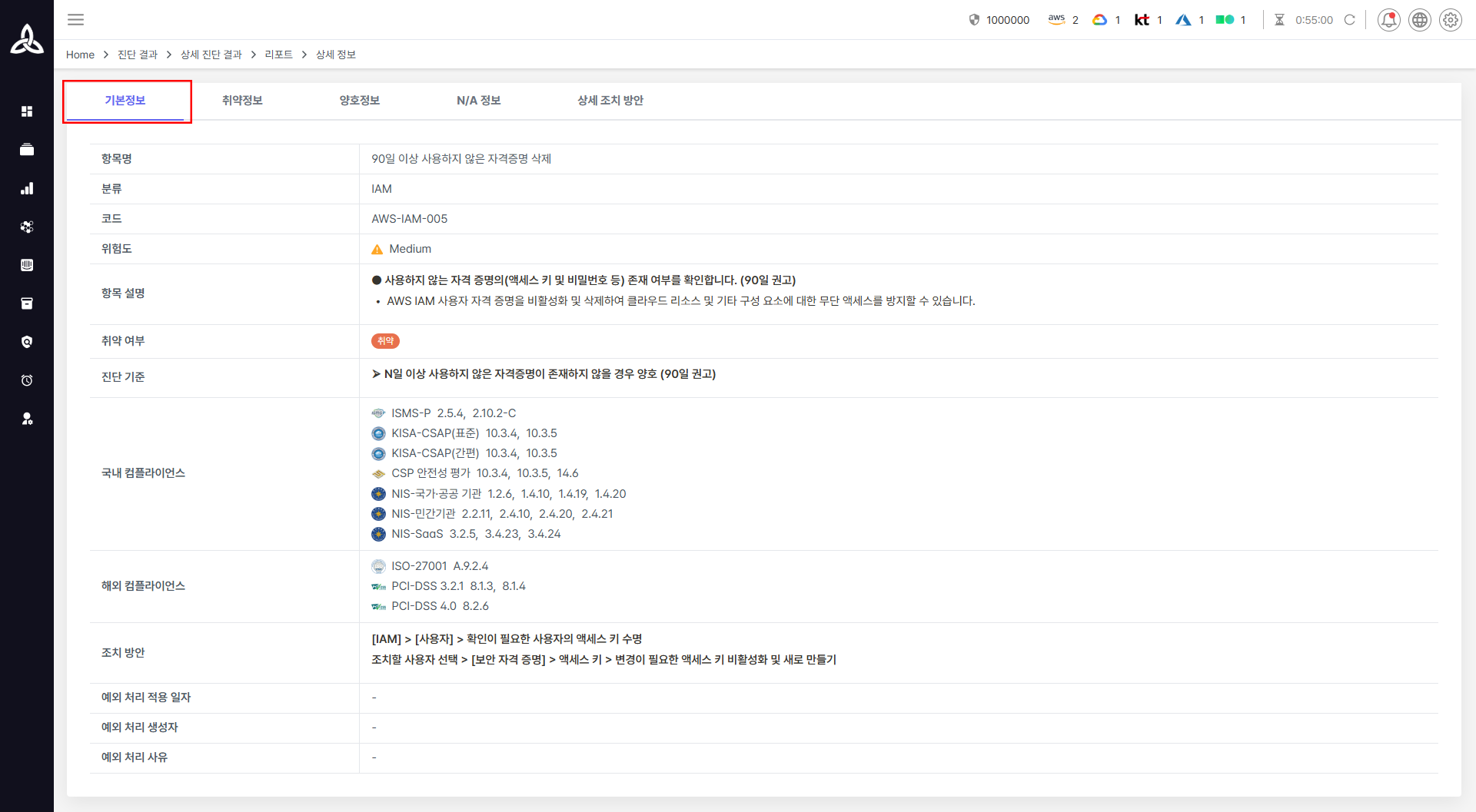 전체 항목 및 각 리소스 별로 점검 항목들을 확인할 수 있고, 상세 정보 메뉴를 통해 점검 항목의 기본정보, 취약정보, 양호정보, N/A 정보, 상세 조치 방안을 확인할 수 있습니다.