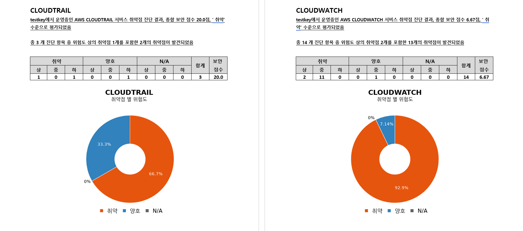 워드보고서를 통해 전체 서비스에 대한 총평과 서비스 별 진단 현황을 확인할 수 있으며,